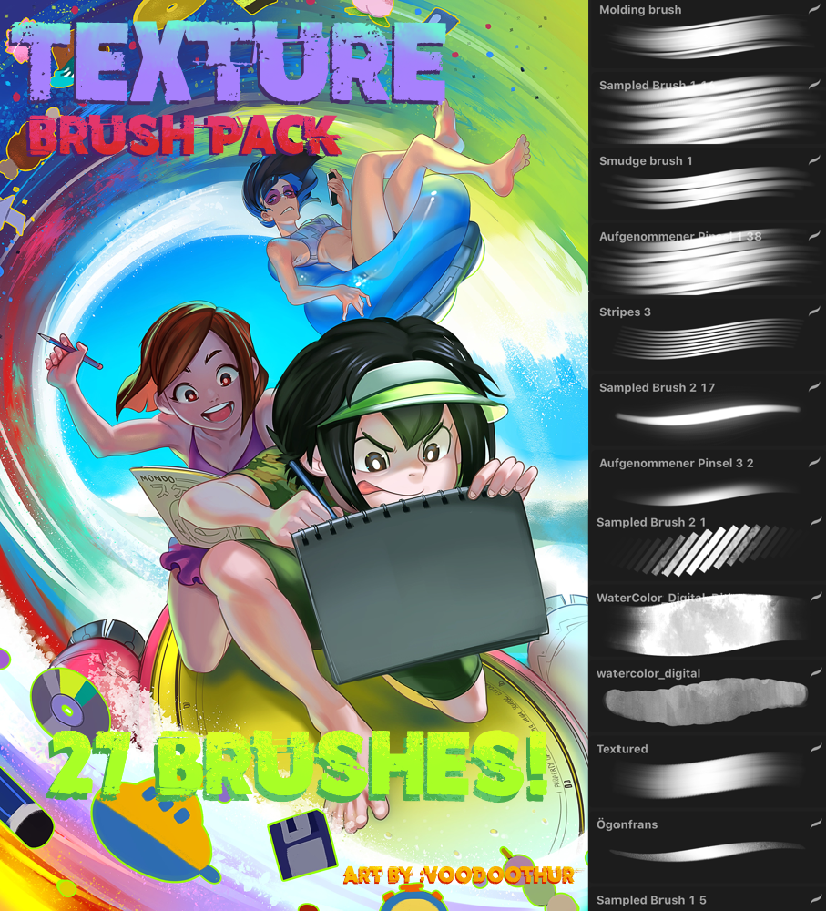 This pack has 27 brushes.These brushes will add more detailed textures to your work.Turn on your creativity and use them to the fullest :3