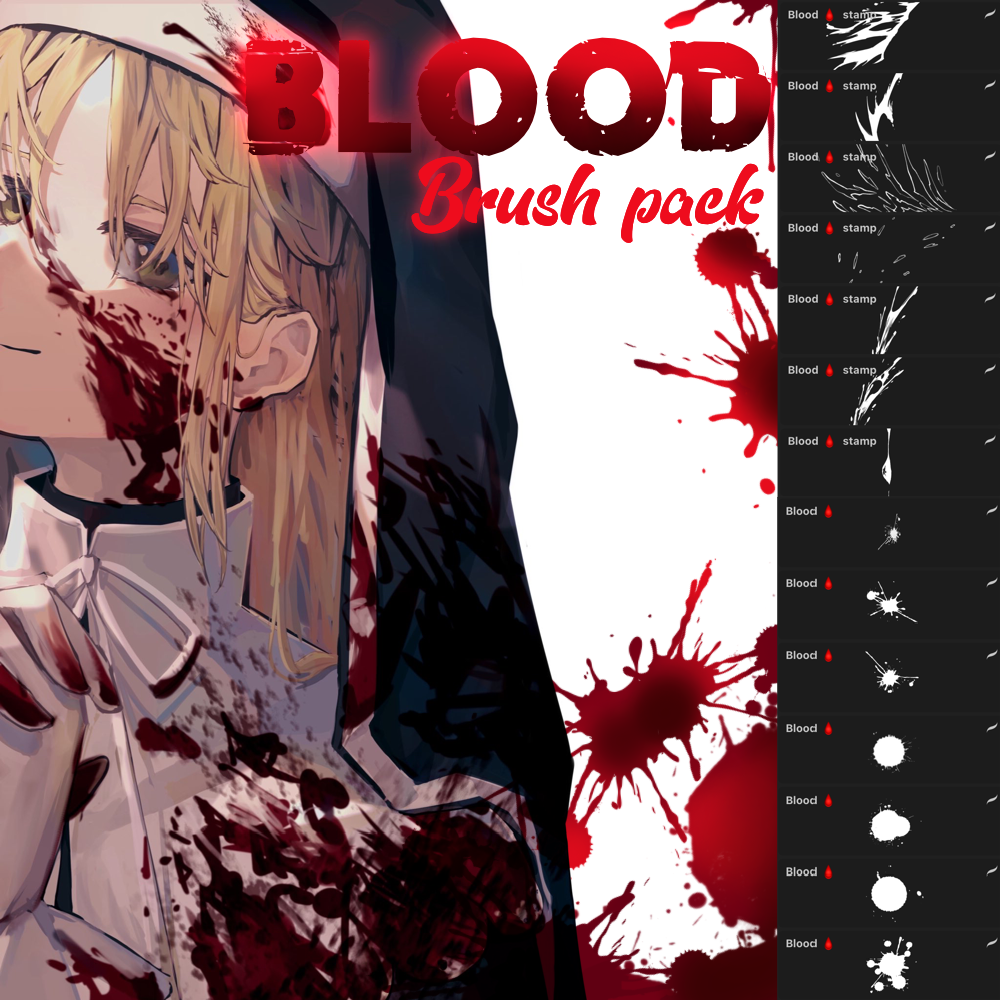 This pack has free 4 brushes + 6 stamps.These brushes will add more detailed drops blood to your work.Turn on your creativity and use them to the fullest