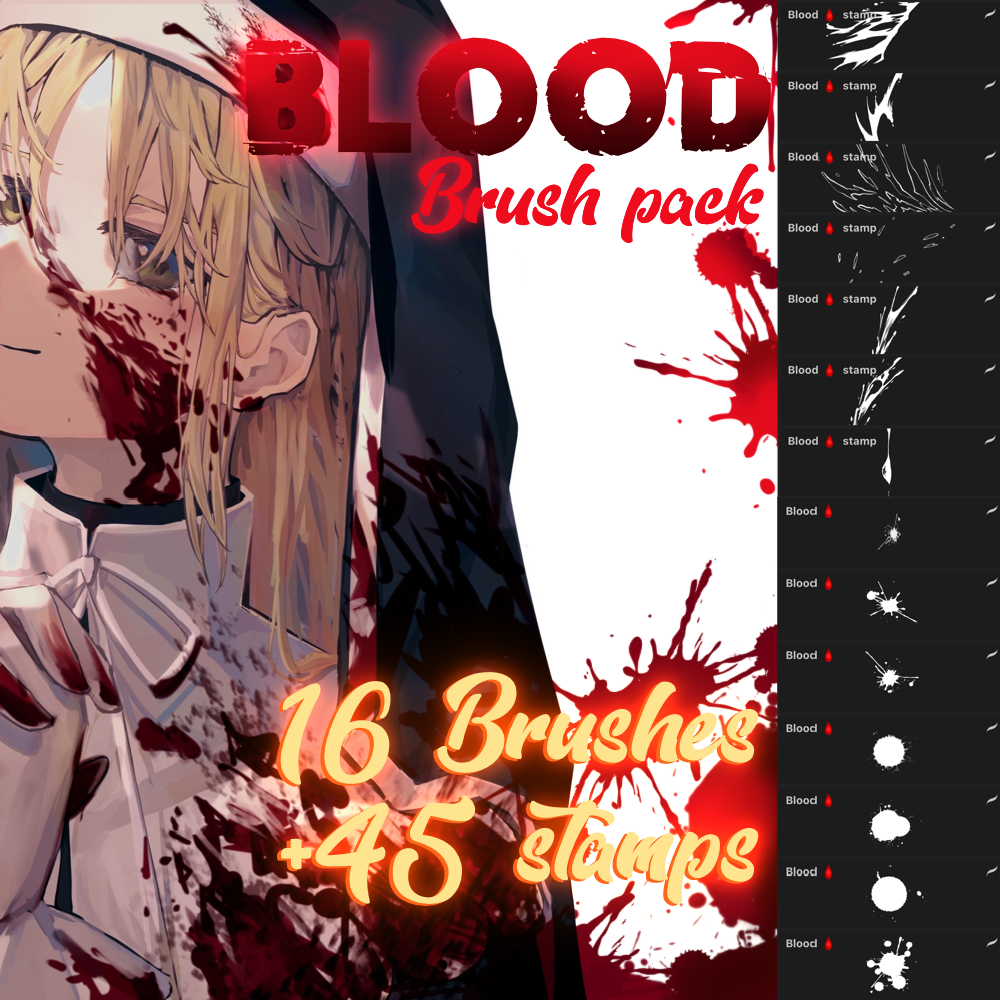 This pack has 16 brushes + 45 stamps.These brushes will add more detailed drops blood to your work.Turn on your creativity and use them to the fullest